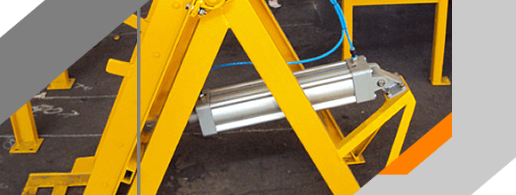 Sirven para elevar y bajar los cilindros de la cama de rodillos. Consta de una base triangular, construida con perfiles de hierro en “L” de 3” y en “U” = UPN 80, soldados. Un eje torneado, montado sobre rodamientos, acopla con una cuna con rodillos de 1,5 metros de longitud. Los rodillos están construidos con caño de 60mm de diámetro por 320mm de longitud, el eje es de 20mm y tiene rodamientos de ambos lados. Mediante un pistón neumático, permite girar la cuna, accionando la llave de comando.