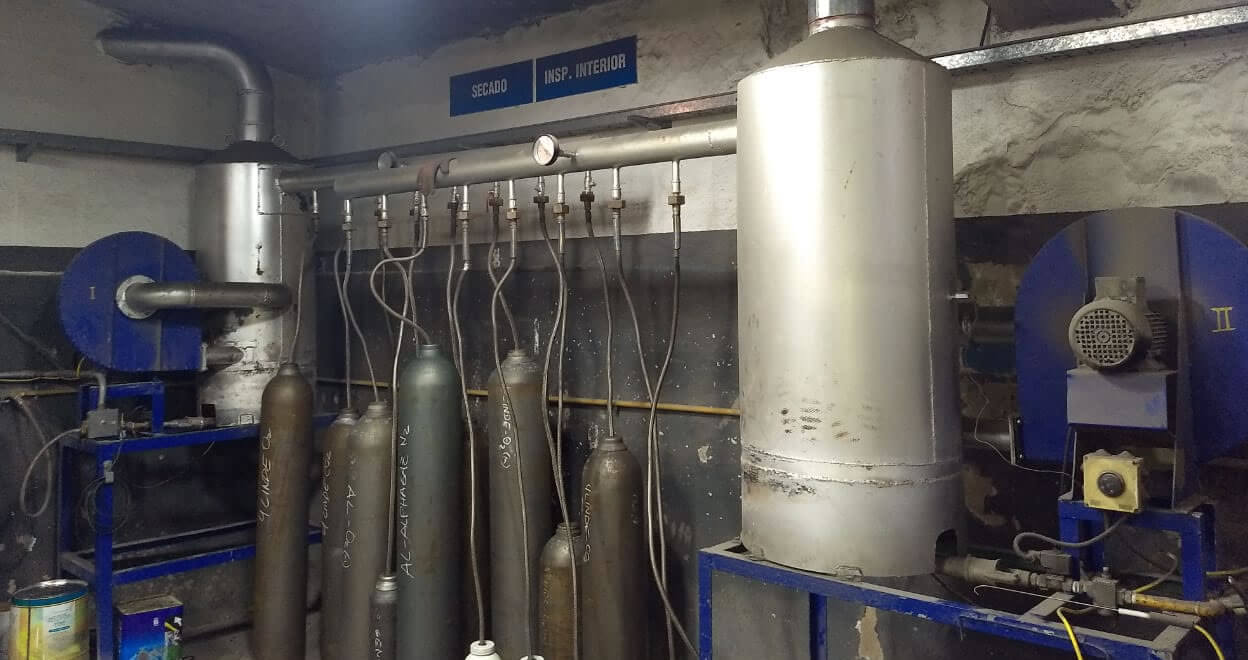 La base está construida por perfiles de hierro en “L” de 1” soldados. La Caldera es de chapa de 3,2mm de espesor, plegada y soldada. Consta de 2 recipientes, uno externo de 600mm. de diámetro y otro interno, 12 caños sin costura de diámetro 40mm, están uniformemente distribuidos, se conectan a un cono superior, 2 placas de ½” de espesor, cierran los recipientes. Un electroventilador aspira el aire que ingresa a la secadora presurizado. Un quemador industrial lo calienta.El comando se realiza a través de un tablero eléctrico, permite regular la temperatura del aire al valor deseado. De la misma sale un caño de 100mm de diámetro por 2mts. de longitud, donde se encuentran: el termómetro, 8 válvulas, 8 mangueras especiales que son las que ingresan por la rosca del cilindro, para el secado correspondiente.